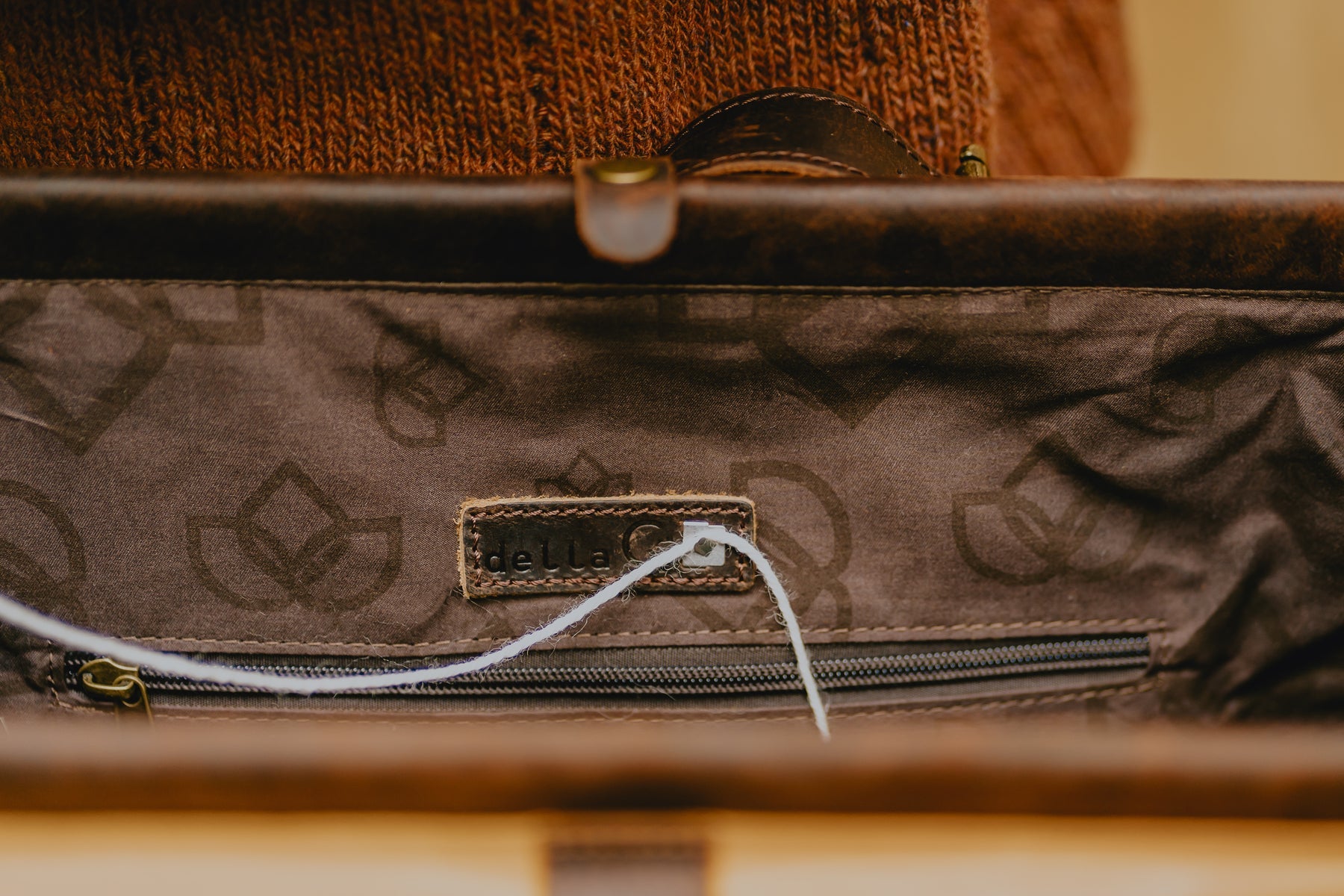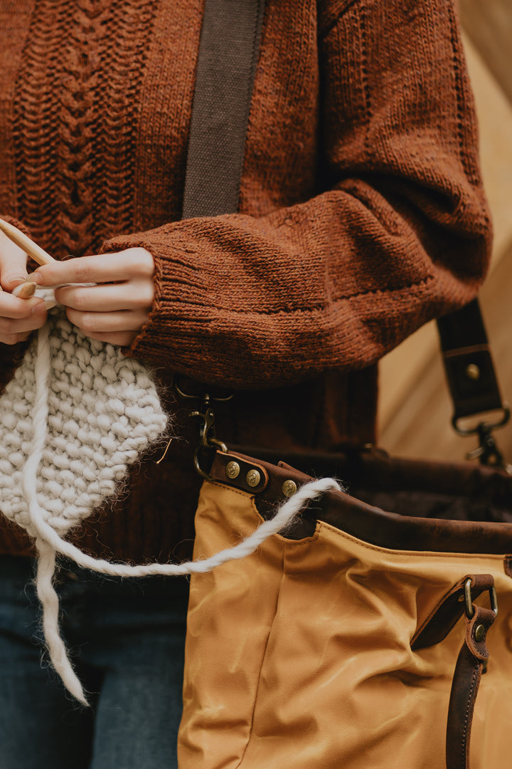 Made in soft genuine leather details with brass accents, our newest bag also features an adjustable shoulder strap, a yarn feeder and cutter, decorative pin with 3 emergency lotus stitch markers.