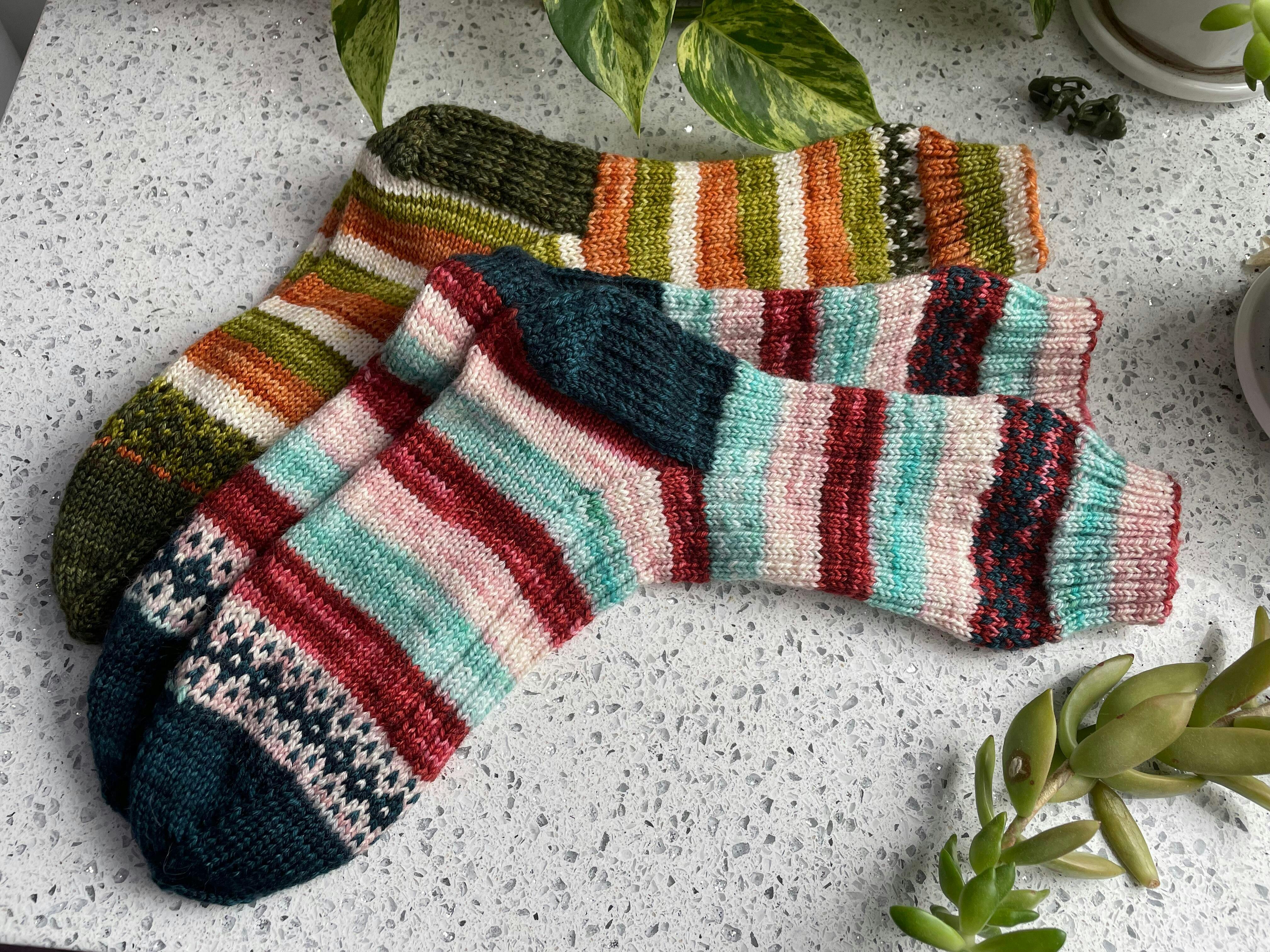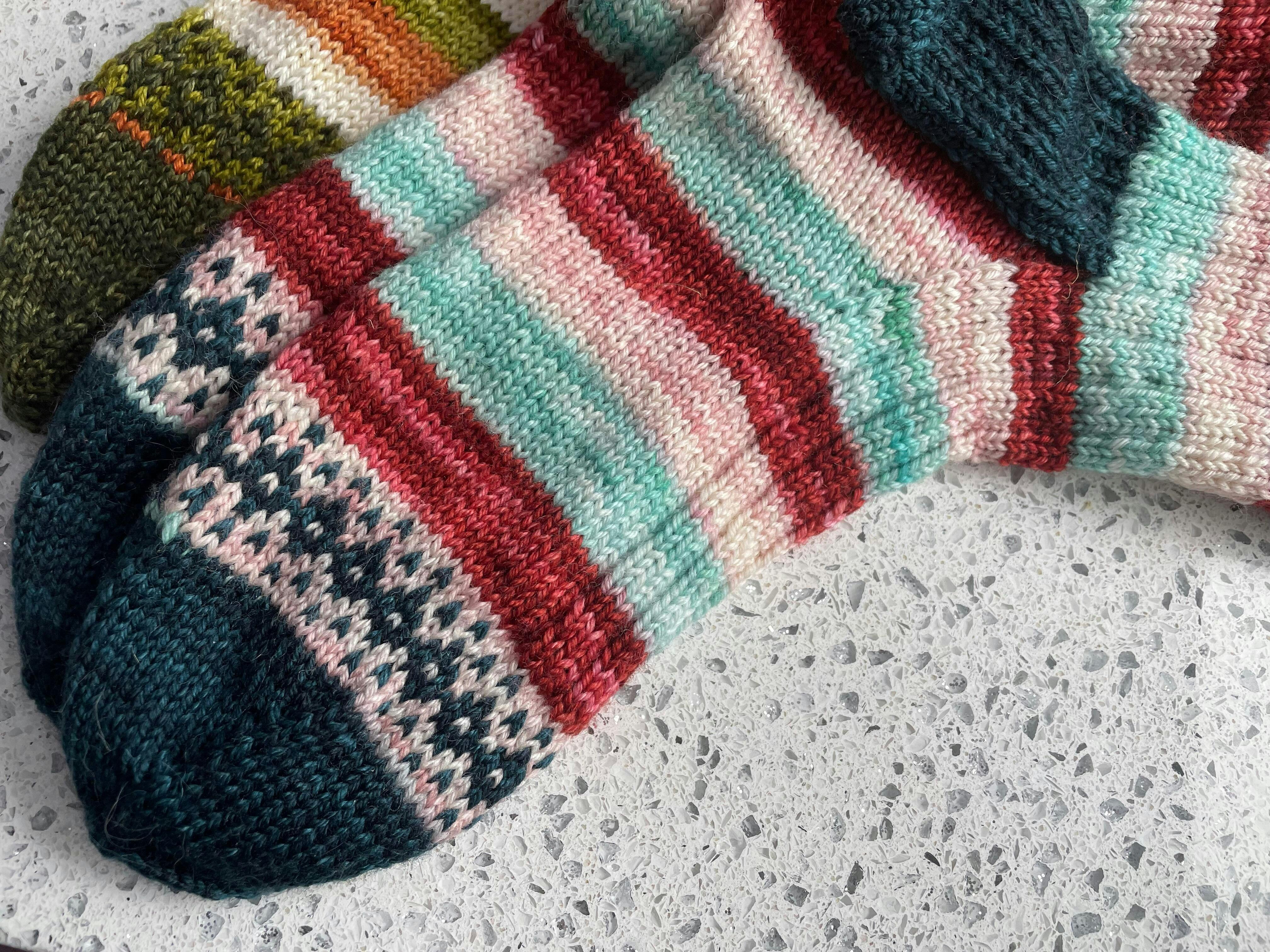 This hand-dyed sock yarn is made of 85% merino wool and 15% nylon.