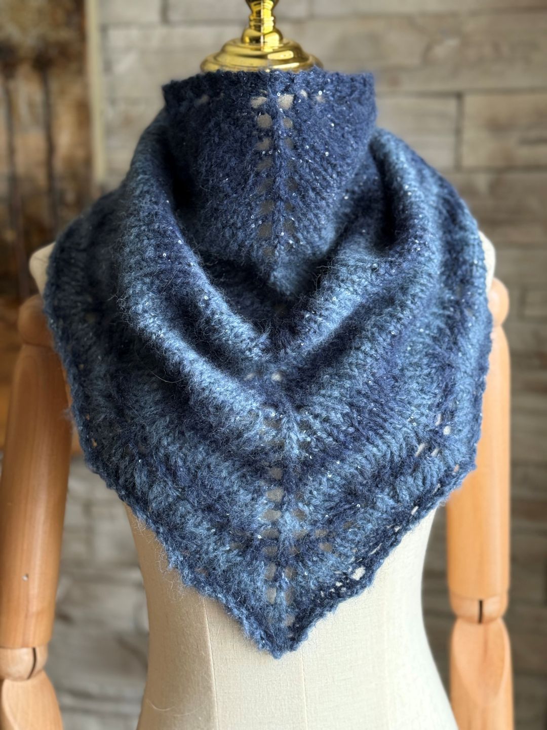 The inspiration for this shawl came from the yarn itself. With its beautiful silver sequins and brushed merino fiber, it was