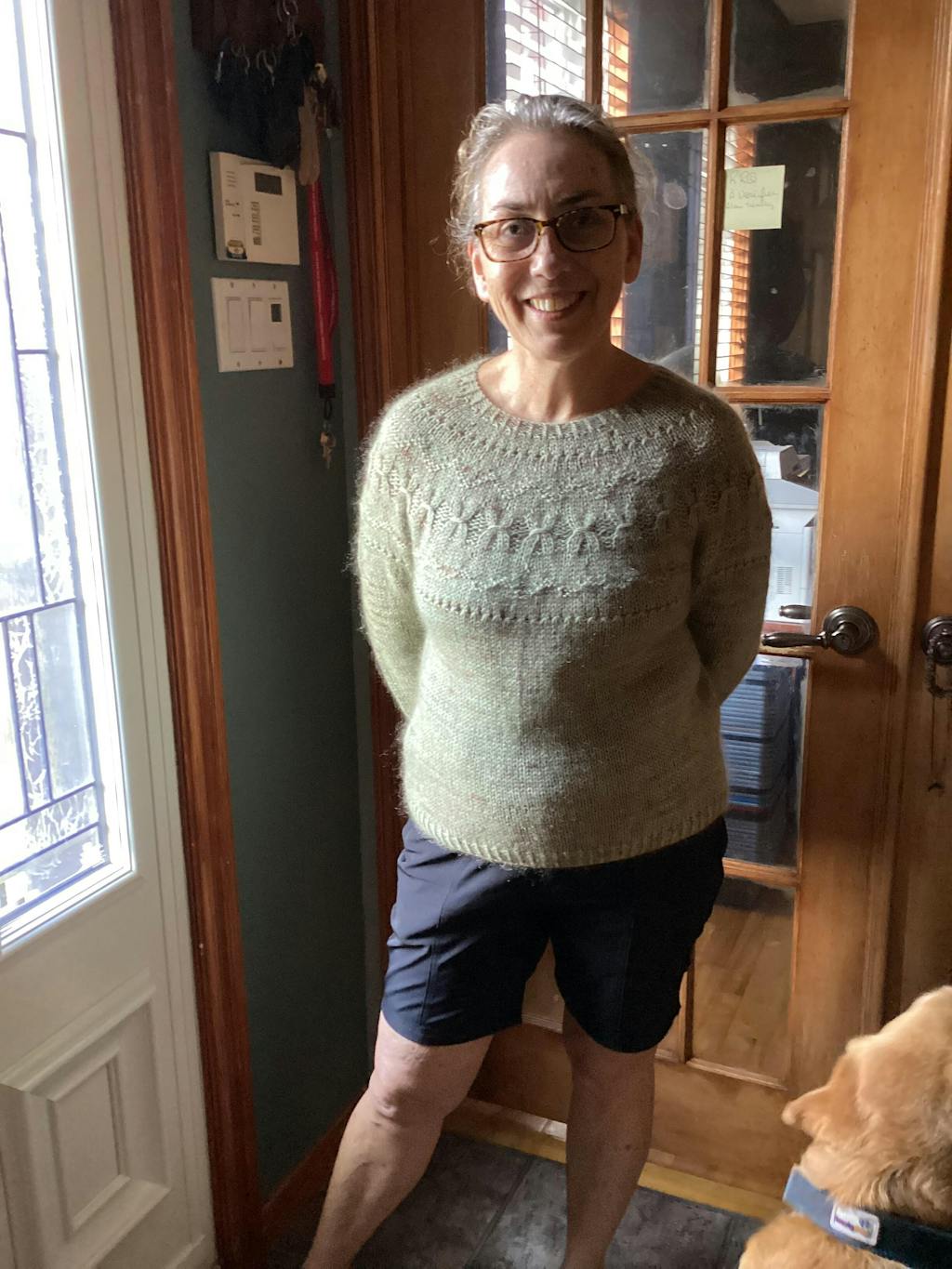 Pretty Ribbons is knit seamless from the top down in a circular yoke construction and meant to be worn with 4 – 6 inches of positive ease. For reference, the samples in the photo are worn with 5 inches of positive ease. Follow the charts for your size and yarn weight. The sample that is knit double stranded with Hermoine and Super Sock is knit on larger needles so that the finished garment is light and airy. The stitch patterns are written and in chart form at the end of the pattern.