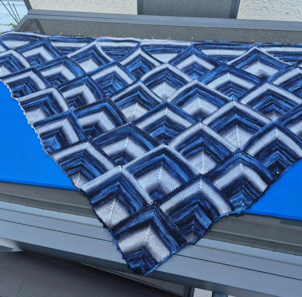 This design features the modular knitting technique, offering a unique way to explore and enjoy the beauty of self-striping colors. Making this shawl will bring you joy since every diamond is a precious "gem" to knit: each one reflects colors in a distinct way! Discovering them is always a surprise, turning the process into a genuine pleasure.