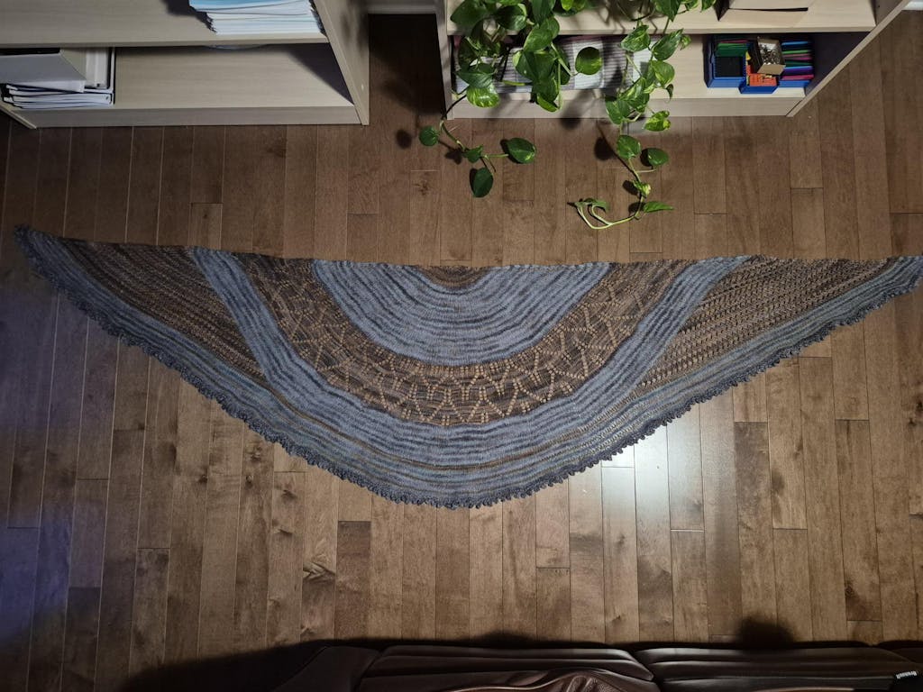 This shawl features a central section shaped like a downward-pointing quadrant (see the green area in the diagram), where 8 stitches are added every six rows. Additionally, on either side of the quadrant, there are extra increases (shown by the pink triangles) and a series of short rows (indicated by the blue triangles) to widen the piece. The increases are depicted by the white dashed line.