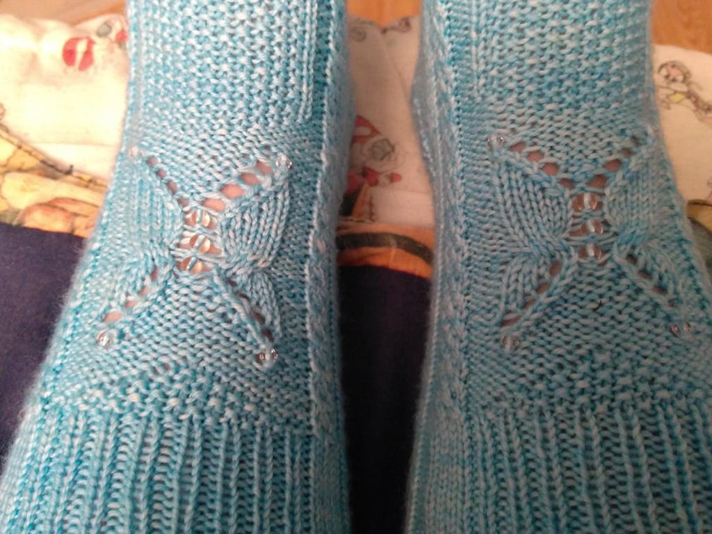 Featuring a beautiful frozen butterfly beaded stitch pattern on the front of the leg, these Papillon de Glace socks will have you flying over the rainbow!