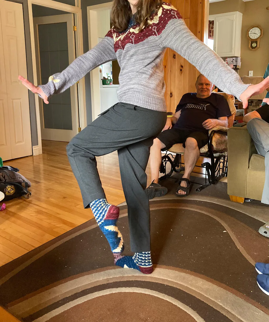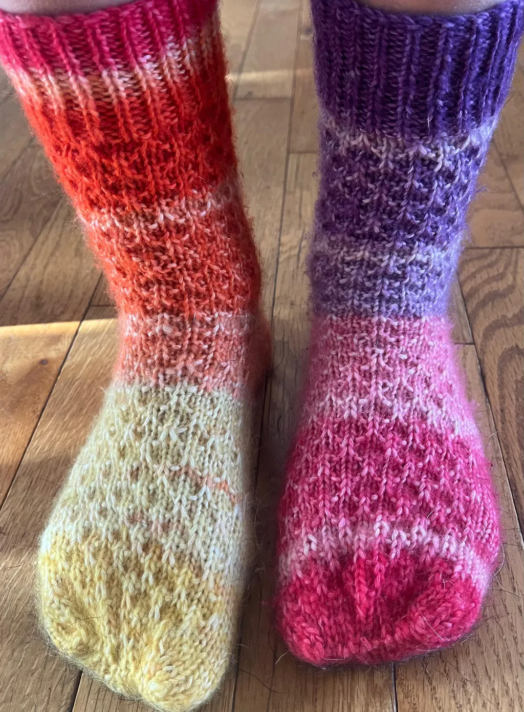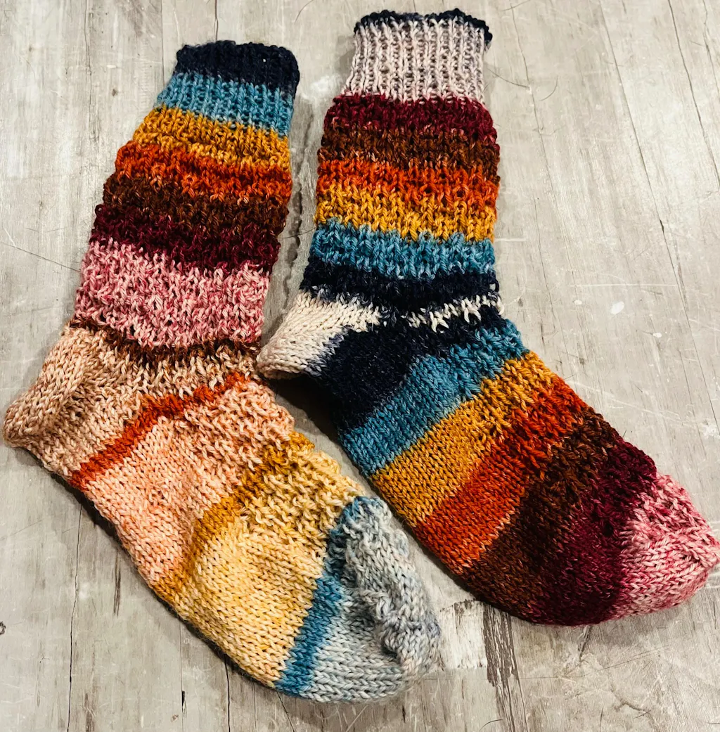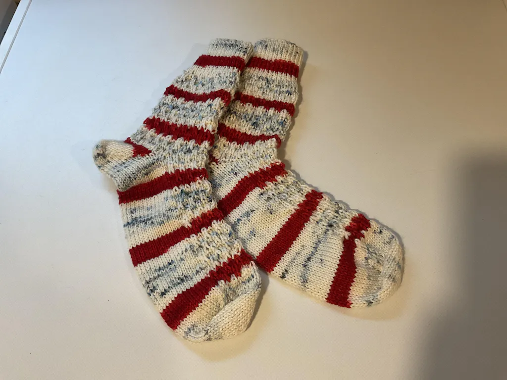 Introducing Rudolph's Socks, designed by Louise Robert for the 2023 Biscotte Advent Calendar. This sock pattern is written for DK-weight self-striping yarn and includes sizing for the whole family.