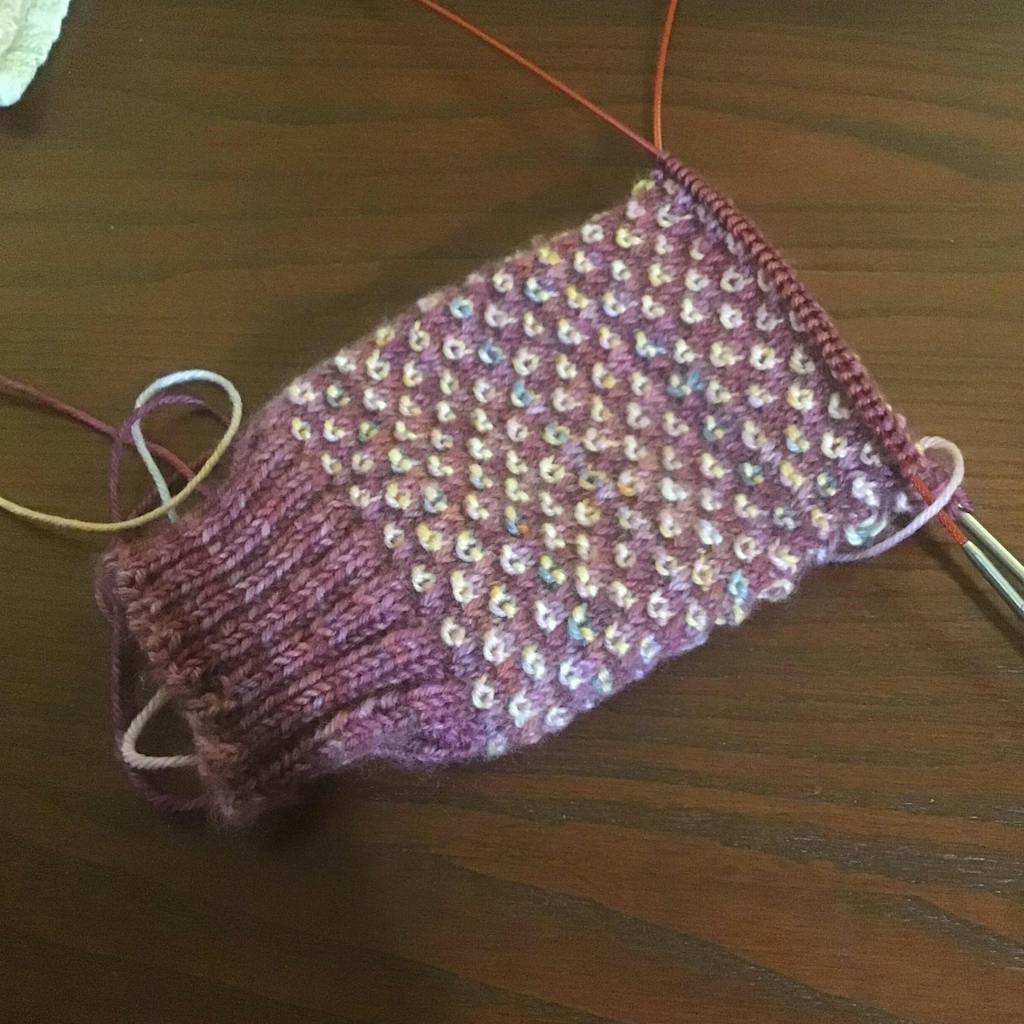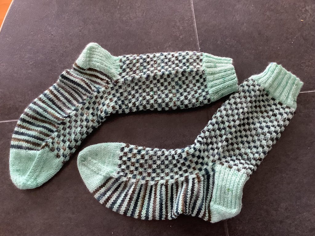 These socks are knit from the cuff down with a simple mosaic design. Only one color is used at a time making the stitch pattern easy and enjoyable