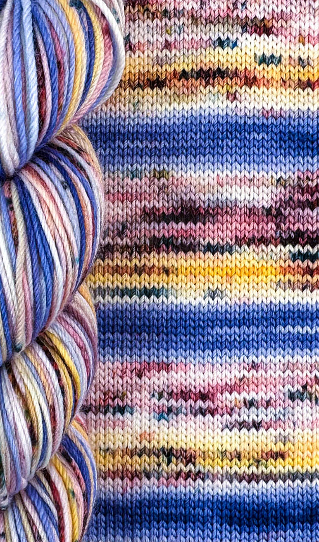 This hand-dyed sock yarn is made of 85% merino wool and 15% nylon.