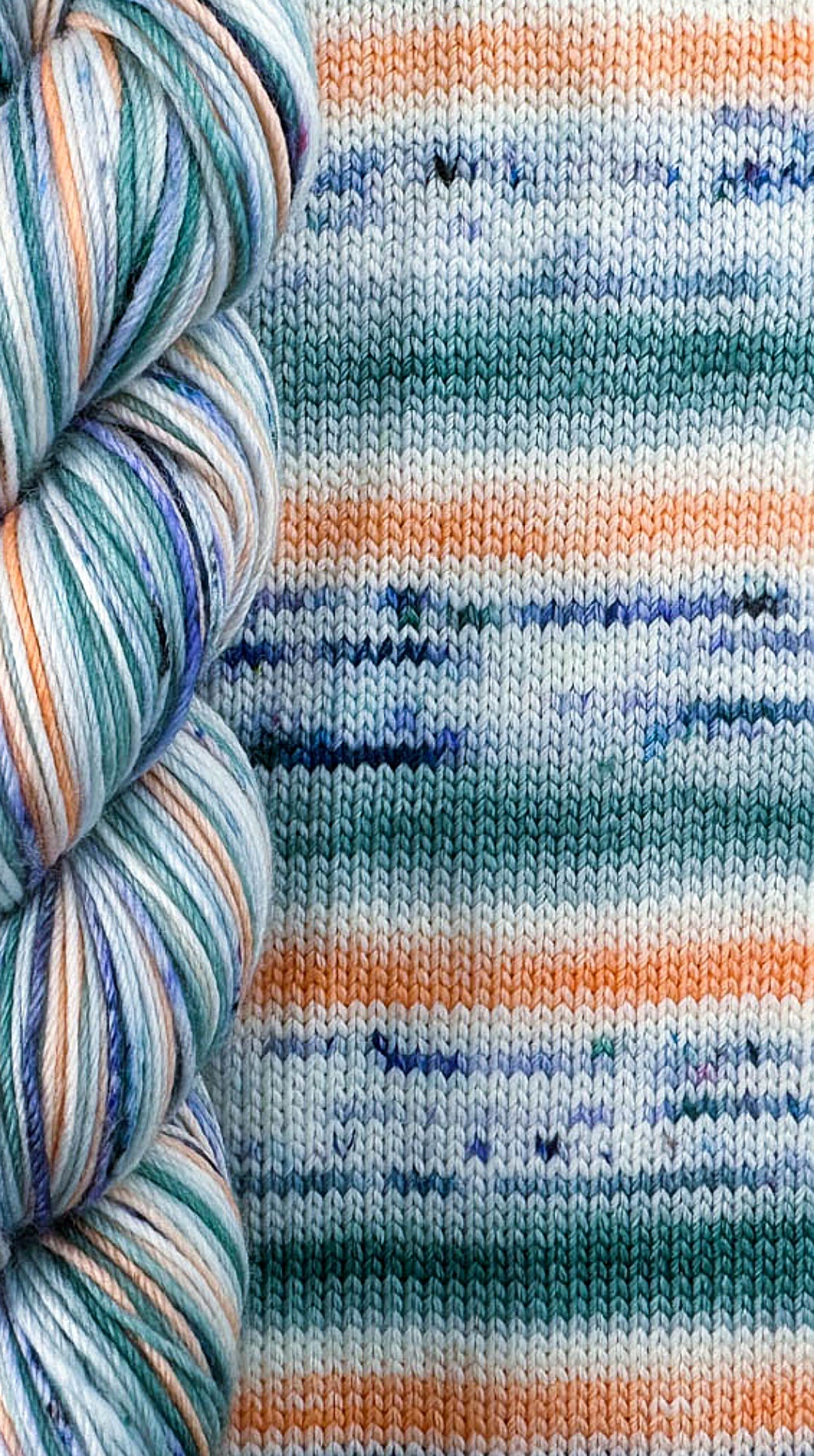 This hand-dyed sock yarn is made of 85% merino wool and 15% nylon.