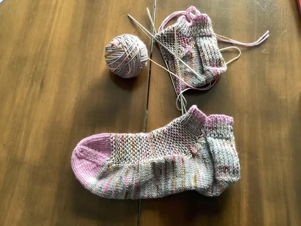 This hand-dyed sock yarn is made of 85% merino wool and 15% nylon.