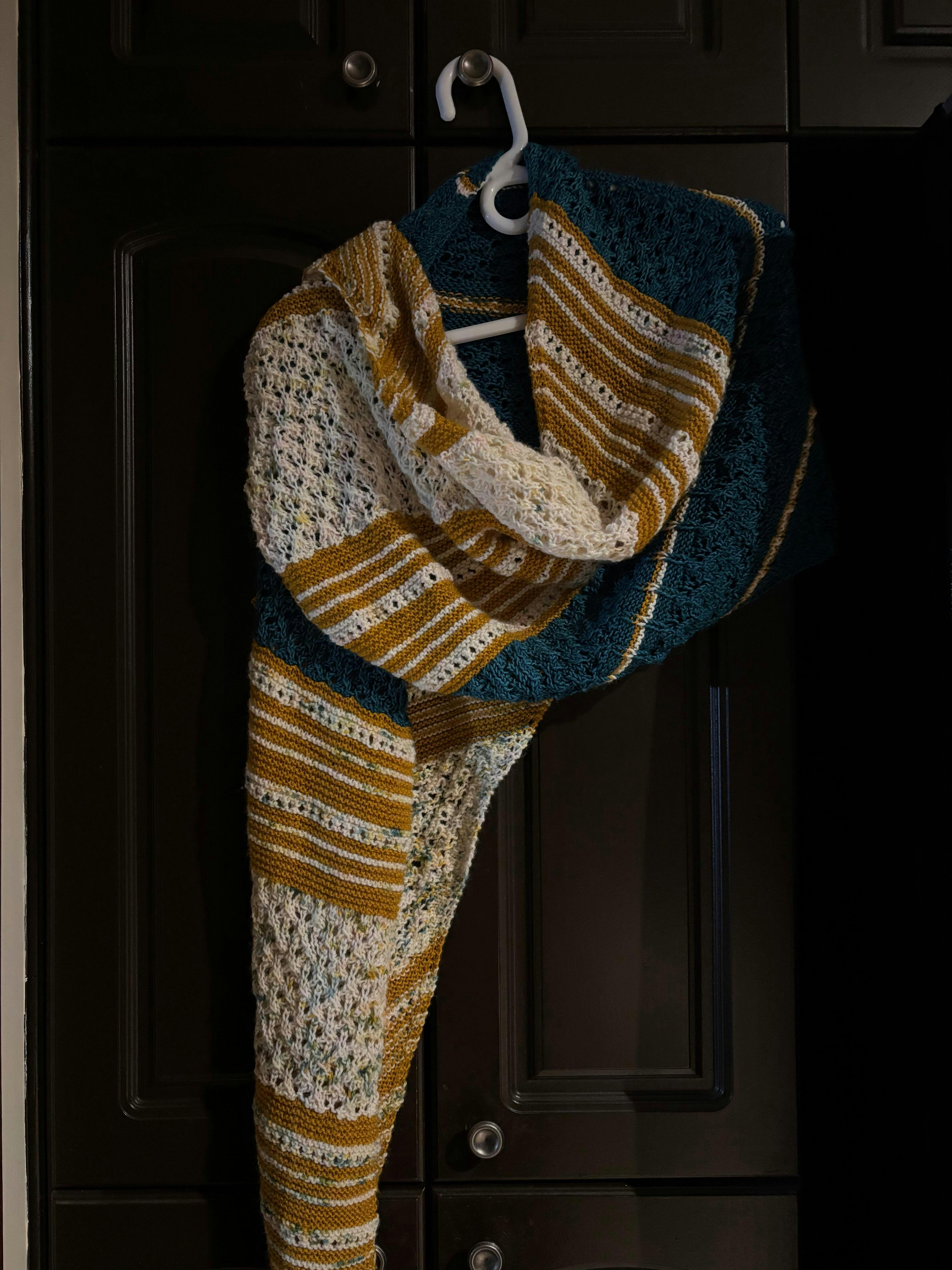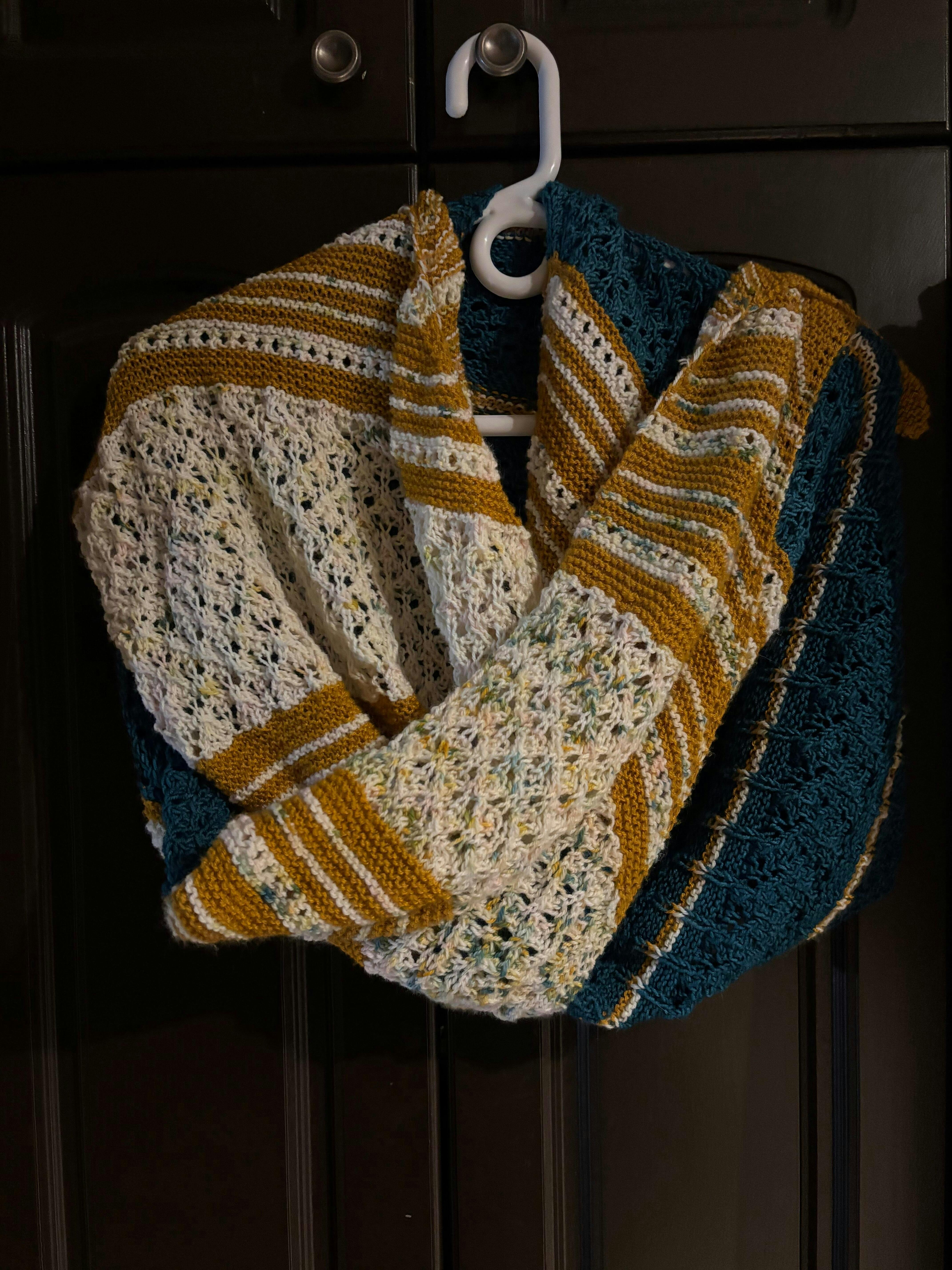 The center features repeats of lace, stripes and slipped stitches resting atop garter stitch. After working across the center section, you’ll begin the gentle descent down to the bind off by working a decreasing version of that first, striped section.