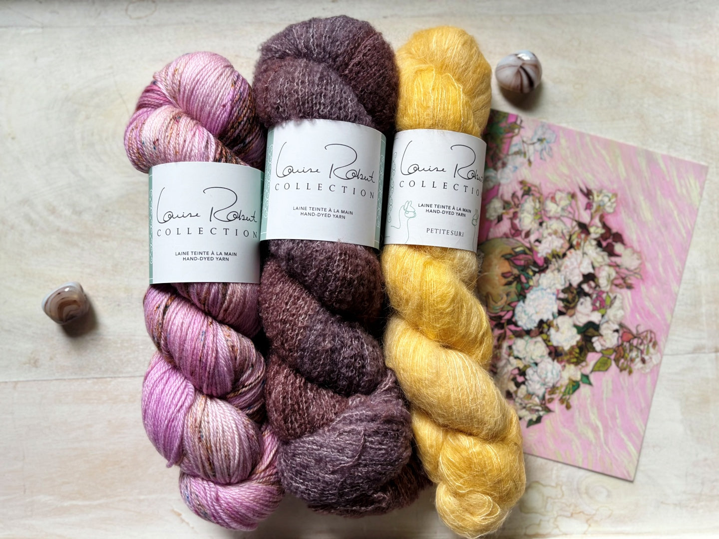 - LOUISE ROBERT COLLECTION - PETITE BOUCLEE [77% Baby Alpaca, 33% Silk; 400m per 100g] - 1 SKEIN - shown in Marie-Antoinette for kit 1, Ardoise for Kit 2, Dream Baby for kit 3 and Ardoise for the red version.