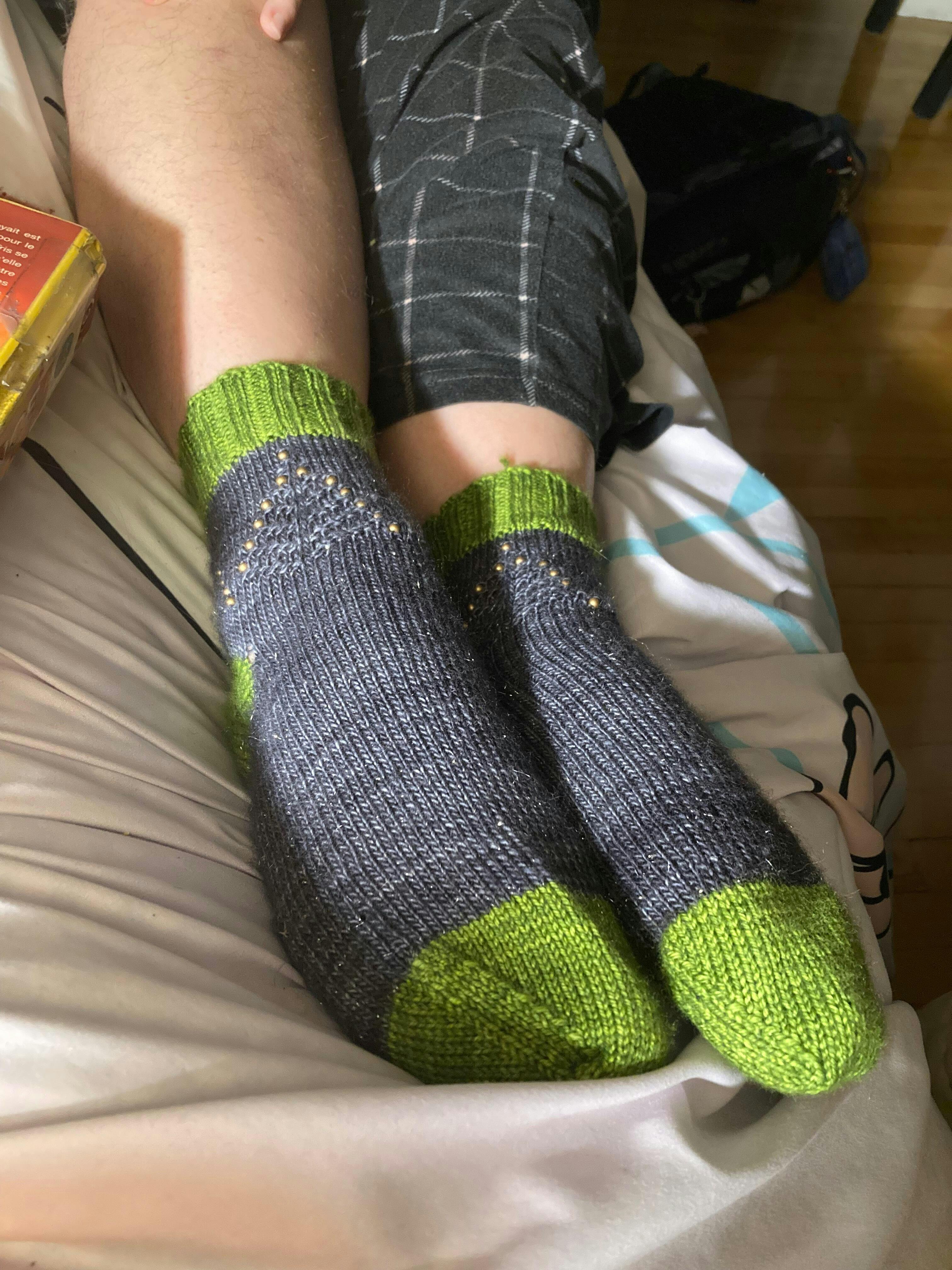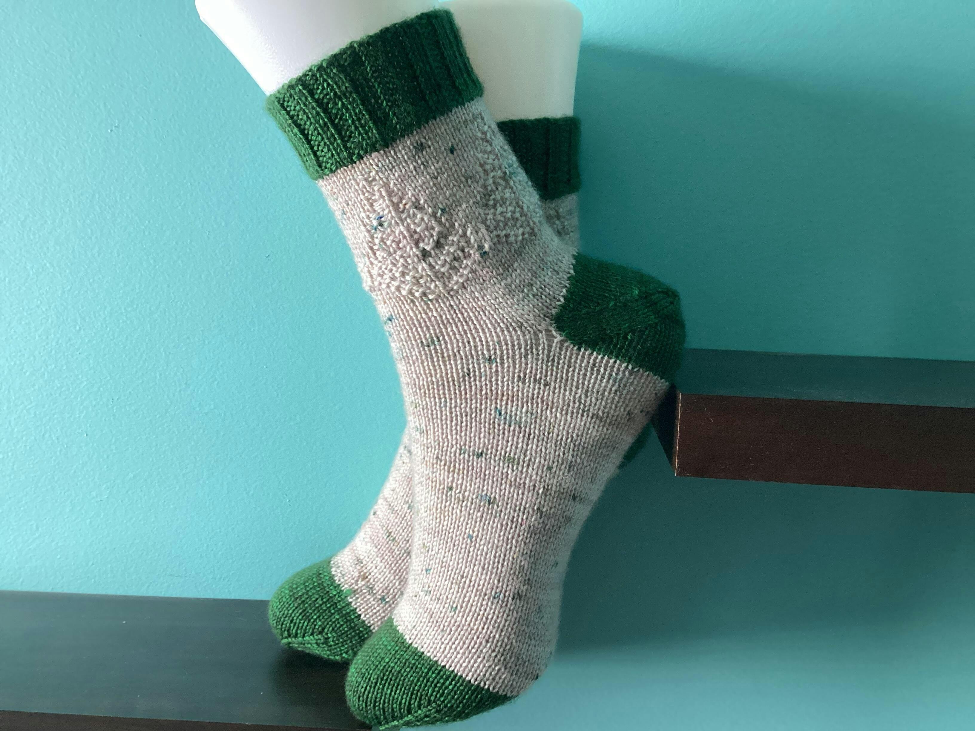The Frosted Branches Socks are knit from the top down with 4 tree motifs around the top of the leg, contrasting heels and toes using 2 different colors and topped off with beads! Heel options are the Forethought Heel or the FLK Heel (link provided) or you can always substitute in your favourite heel of choice. Check out this tutorial for placing a bead.