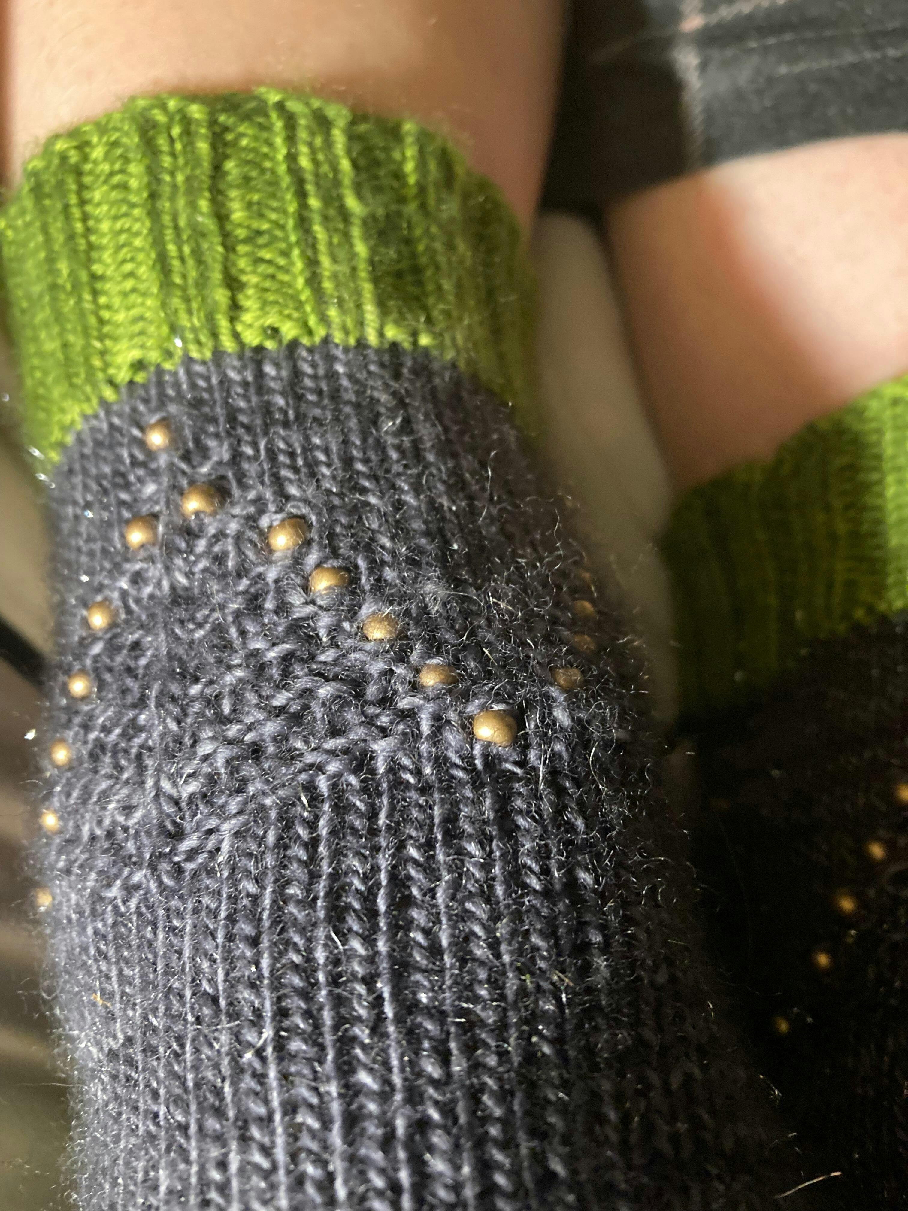 Inspired by a cold winter’s day when the sun hits the ice that glistens the tree’s branches. There is such beauty and inspiration in nature. I‘ve always been inspired by nature and knew I needed to find a way to incorporate these frosted branches into my socks so I could be reminded of it everytime I wore them. The little tree motifs are created using simple knit and purl texture while the clear beads added the perfect amount of frosting. These can also be made into adorable holiday socks using classic holiday colors topped off with colorful beads! These socks were so much fun to design and I hope they bring you as much joy as they have brought to me :) - Andrea Yetman