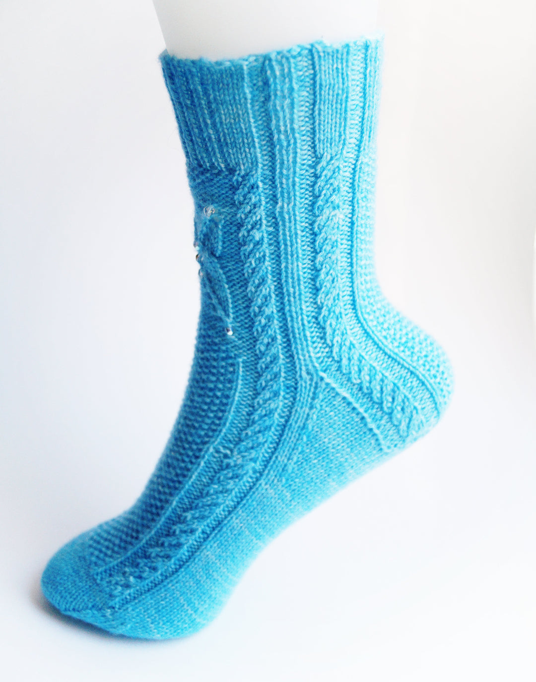 Featuring a beautiful frozen butterfly beaded stitch pattern on the front of the leg, these Papillon de Glace socks will have you flying over the rainbow!