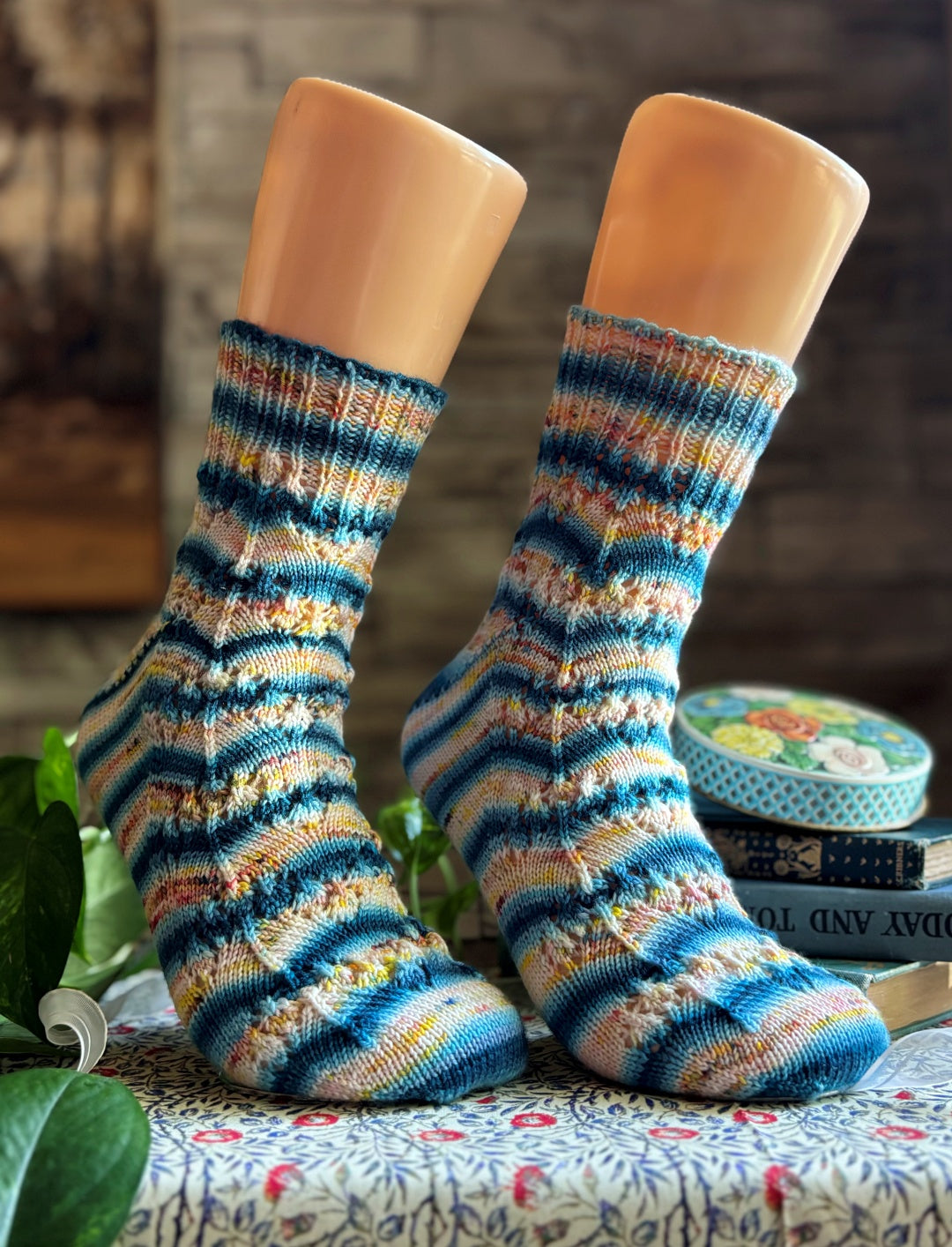 The original socks were crafted with an exclusive color for our club members, but we are now showcasing them to everyone with the return of our yarn color, Rivière Du Loup!