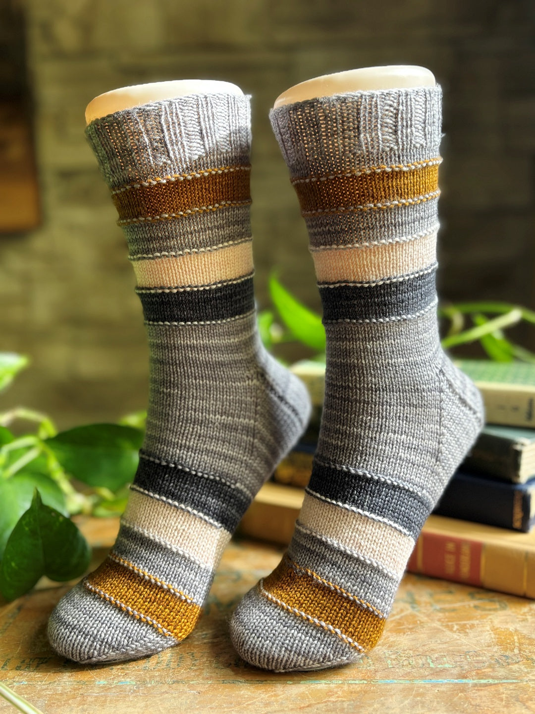 Sometimes, less is more. The relaxing and meditative process of Stockinette knitting consistently provides the most comfort. Adding stripes adds interest and engagement; always looking forward to the next color. The Purl Ridge adds texture and interest to a modern-looking sock. - Andrea Yetman