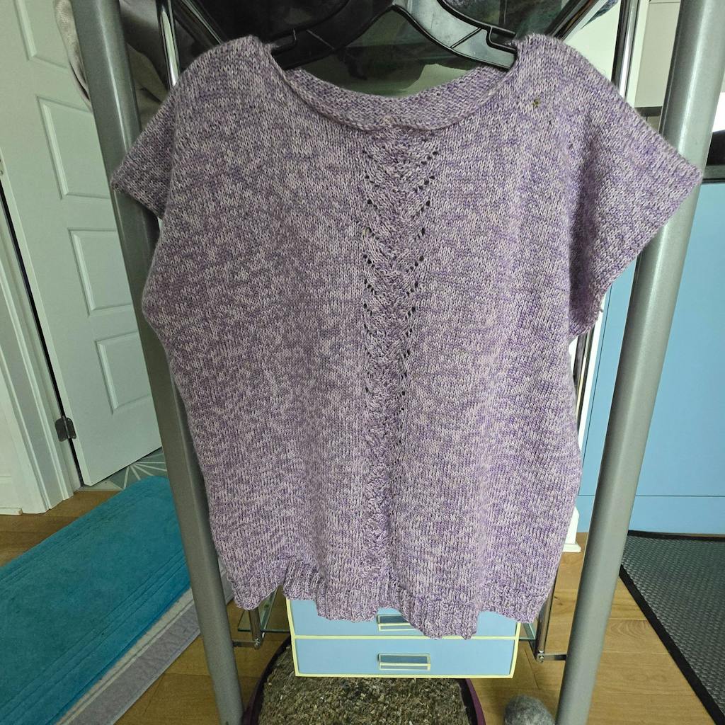 This tee is knit top down starting with the back and then picking up stitches in the cast on edge of the back for the front. There is a little short row shaping for the neckline and for the hem. The tee is joined to knit in the round after the front and back pieces are the desired length. After the tee is knit there is no need to pick up stitches for the neckline or the cuffs of the sleeve. Once casting off at the hem the tee is complete!! Andrea’s Tee is meant to be worn with 8 – 10 inches of positive ease.