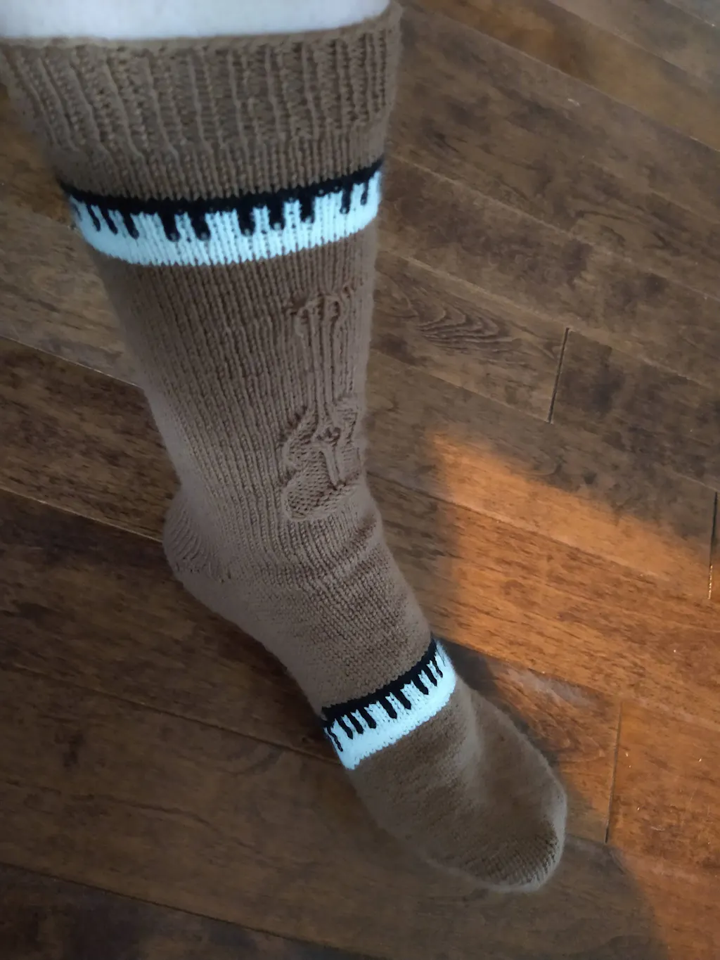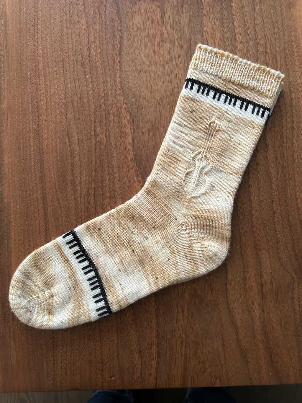 NOTES : This sock design is knitted from the toes up to the ribs. The foot and leg are both featuring a stranded colorwork band depicting a piano keyboard and between the two keyboards, on the leg are "sculpted" two guitars using cables and twisted stitches.