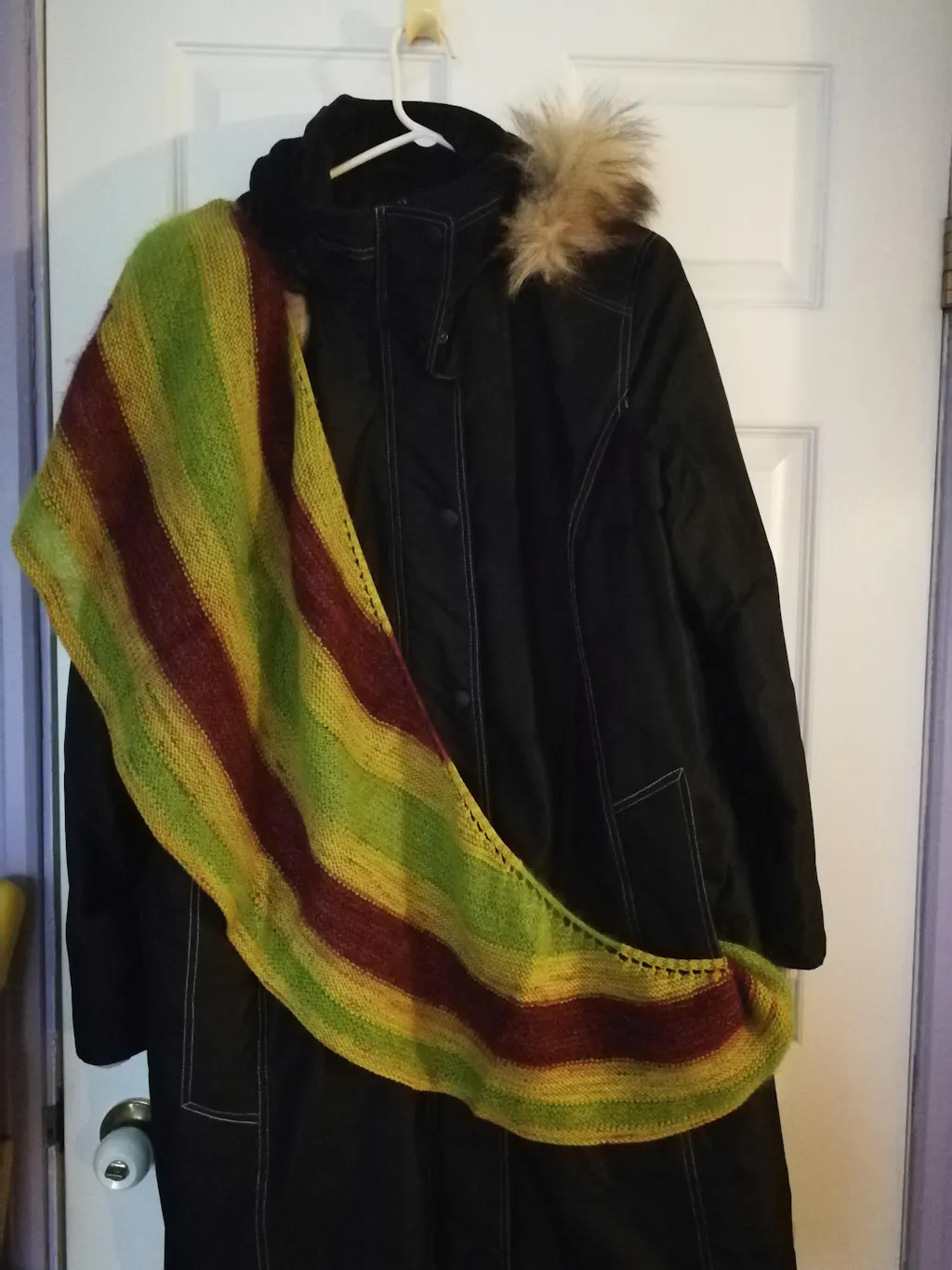 This Shawl is knitted in a crescent shape, created with a combination of garter-stitch strips that repeat like an echo, fading away into the air. The result is a lightweight, airy shawl that is sure to bring a touch of elegance to any outfit.