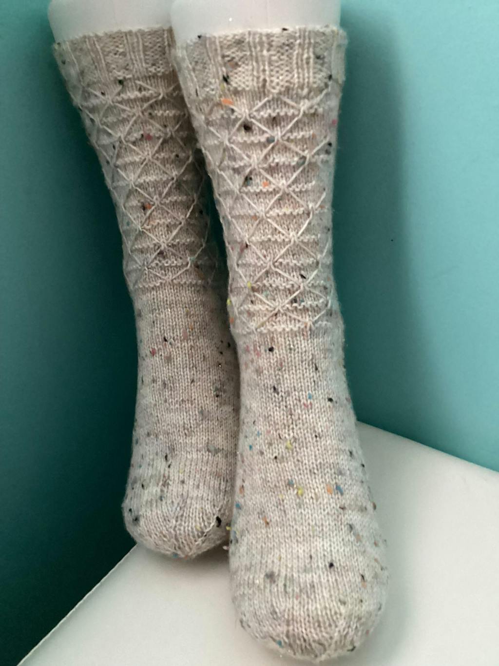 In the original version, the pattern for this sock was only knitted on the front of the leg. I made this choice to preserve the elasticity of the sock.