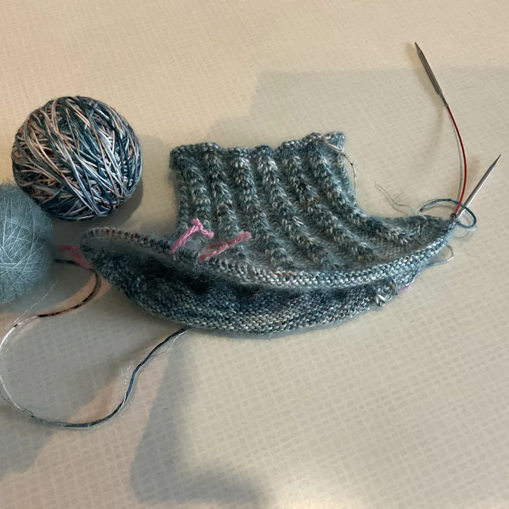 On the next row, work the SL1- GSR (or double-stitch) as one stitch: insert right needle under both legs and work according to the pattern (knit or purl these two legs together).