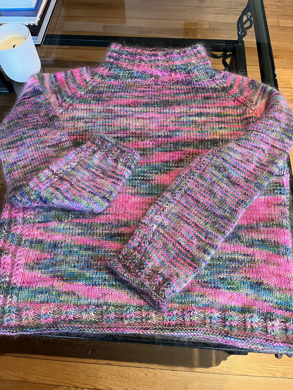The design is seamless, worked top-dow in the round, mainly in stockinette st, in combination with faux cable (no need for auxiliary needle). Back yoke is shaped using short rows.