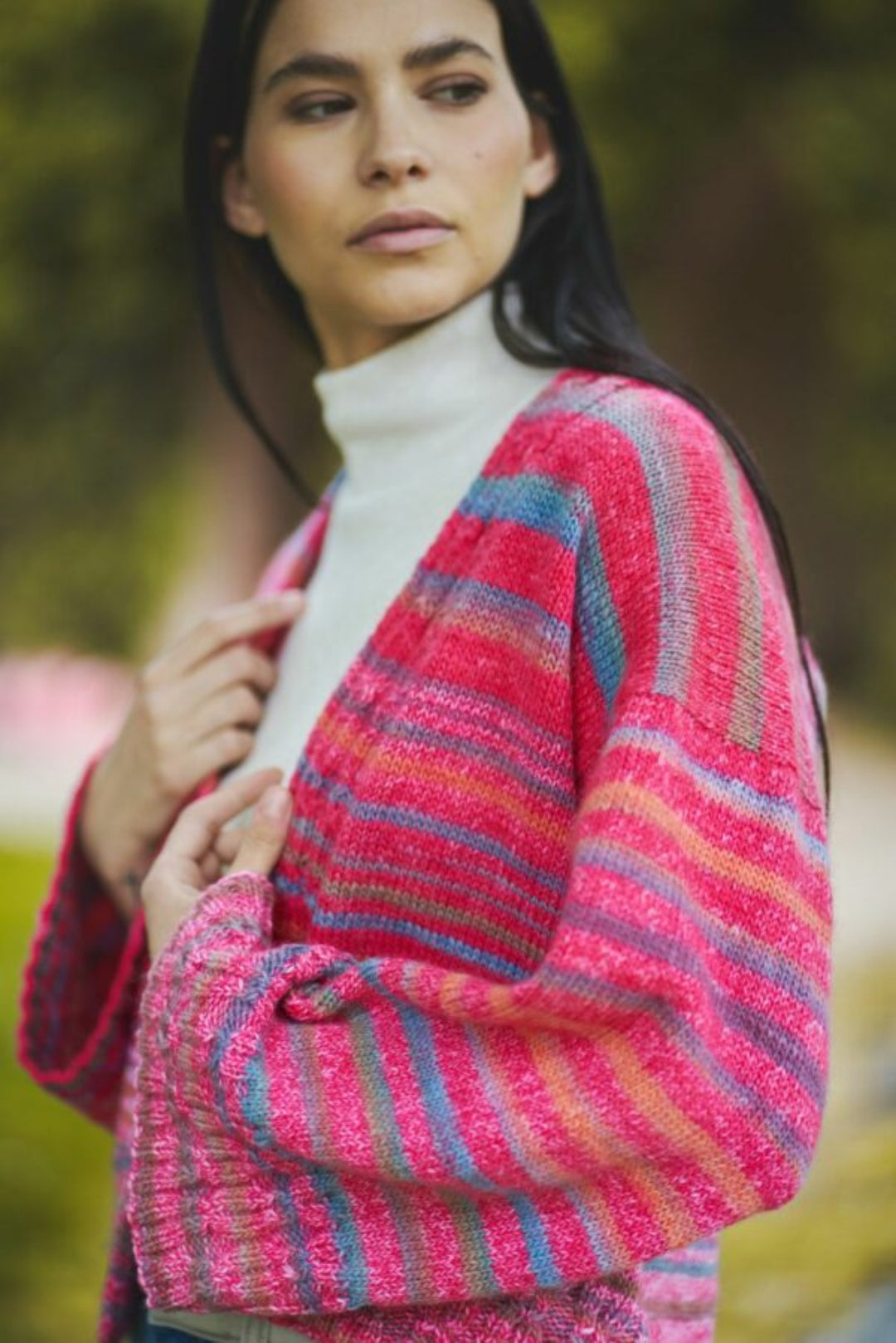 Poema Stripes transforms, evolves and turns into an iconic yarn; created to wrap up and relieve tension through its voluptuous softness; it is ideal for making shawls with the classic degradé effect. The intriguing pattern created by the delicately sophisticated plays of colour will surprise you.