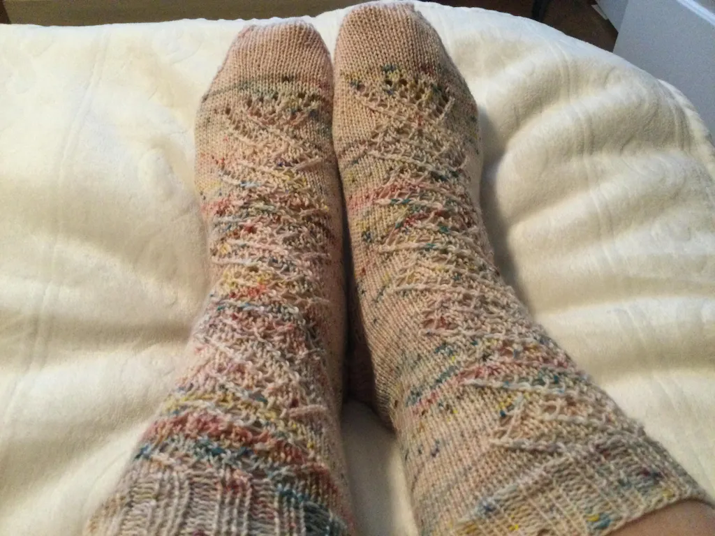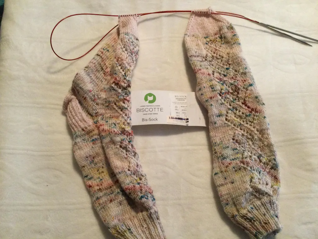 Ces chaussettes sont tricotées du haut vers le bas en utilisant un beau motif de dentelle sur le devant de la chaussette. Ce motif de dentelle est joli comme tout et facile à suivre.