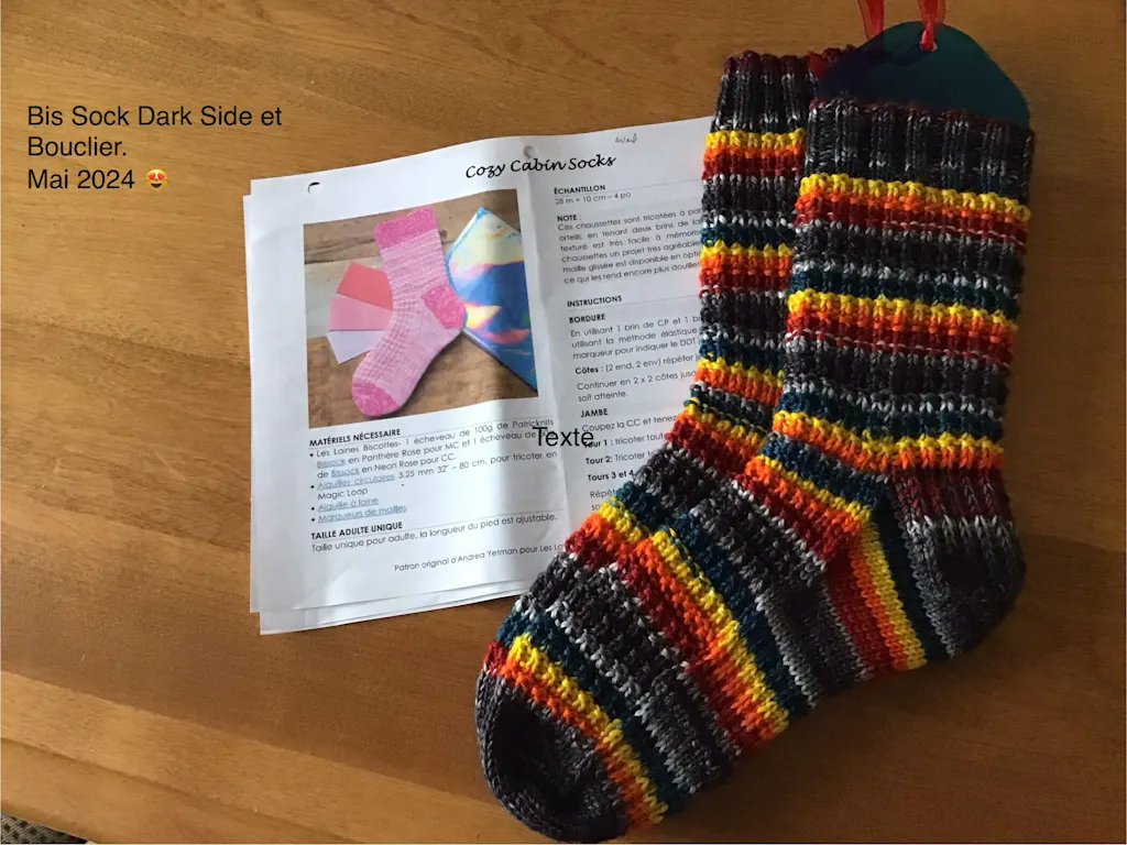 2024-03-25: Section jambe, correction pour la version française au rang 1 pour lire : tricoter toutes les mailles à l’endroit.