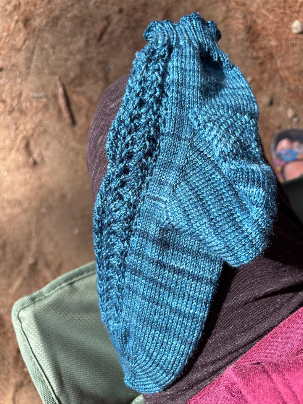 Ces chaussettes sont tricotées du haut vers le bas avec un talon classique à rabat et gousset. Le panneau en dentelle descend sur le devant de la chaussette tandis que l'arrière est travaillé en maille jersey.
