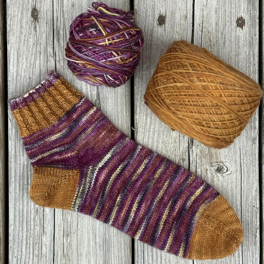 Cette laine à bas teinte à la main est composée de laine de mérinos à 85% et de nylon à 15%.
