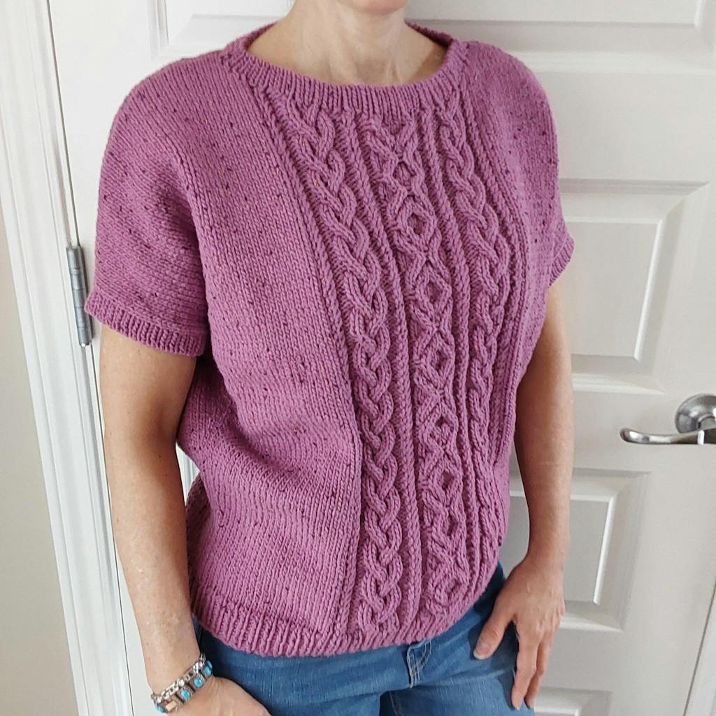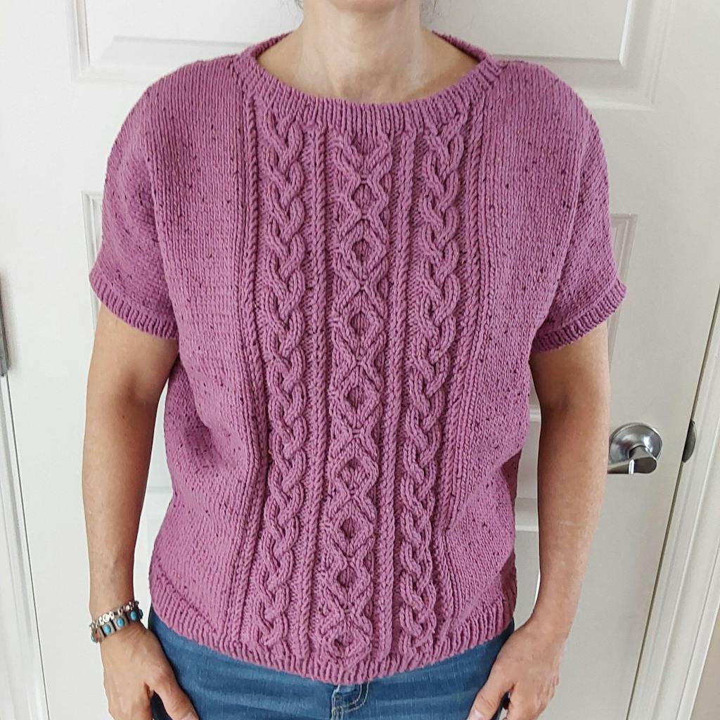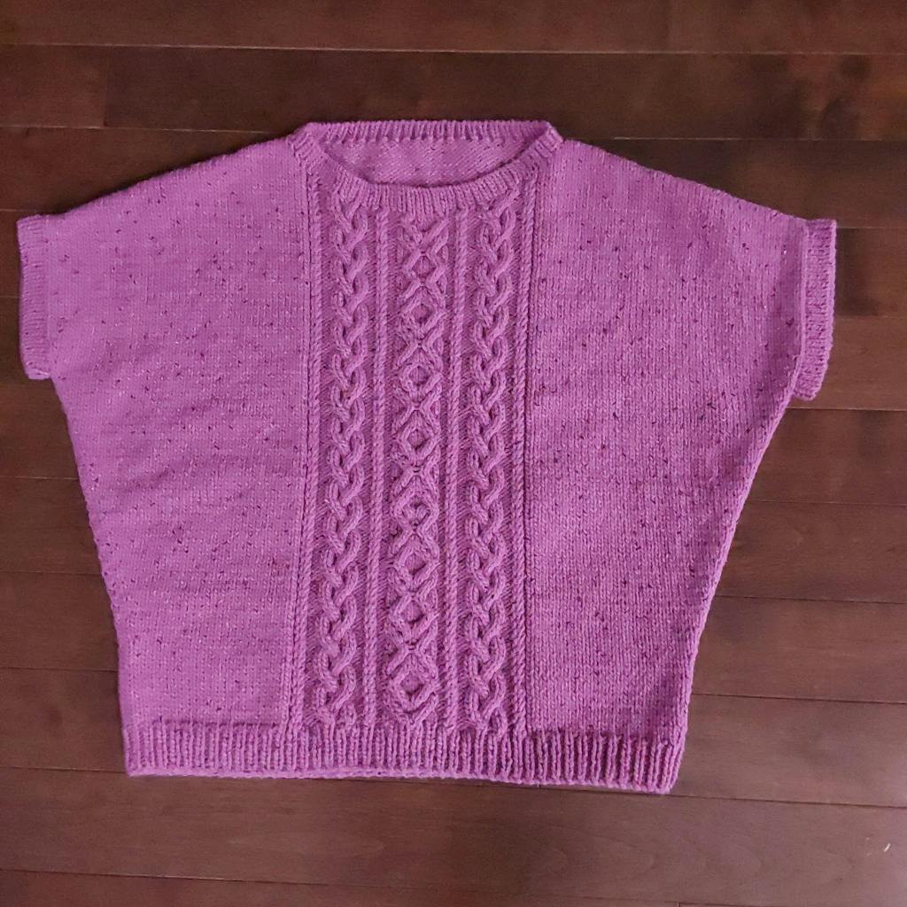 Ce modèle est composé de colonnes de torsades entrecoupés de texture ajourée devant le pull.