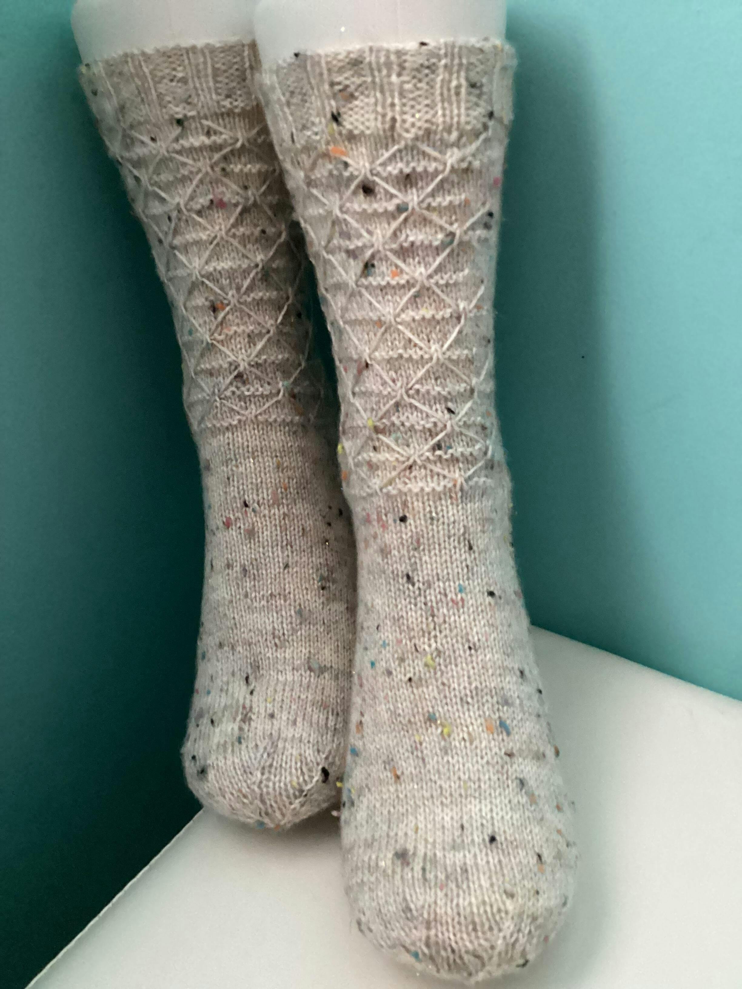Lors de la mise à jour du modèle, une « erreur » s'est insérée dans les instructions, et le motif a été tricoté à la fois sur l'avant et sur l'arrière de la jambe. Cette nouvelle version tricotée a démontré que l’élasticité demeure suffisante pour y glisser le pied sans difficulté.