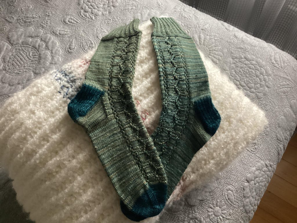 Ces chaussettes sont tricotées à partir du revers avec un panneau en dentelle qui descend sur les côtés extérieurs de la jambe. Avec seulement 1 répétition de dentelle, ce design est attrayant mais toujours relaxant avec beaucoup de point jersey.